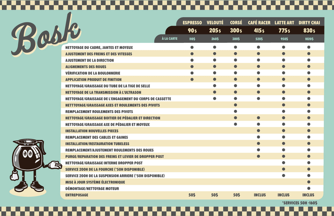 À l’atelier de Bosk, on prend soin de votre bike comme il se doit. Que ce soit une réparation rapide ou une mise au point, on s’assure qu’il est toujours prêt à profiter des sentiers.